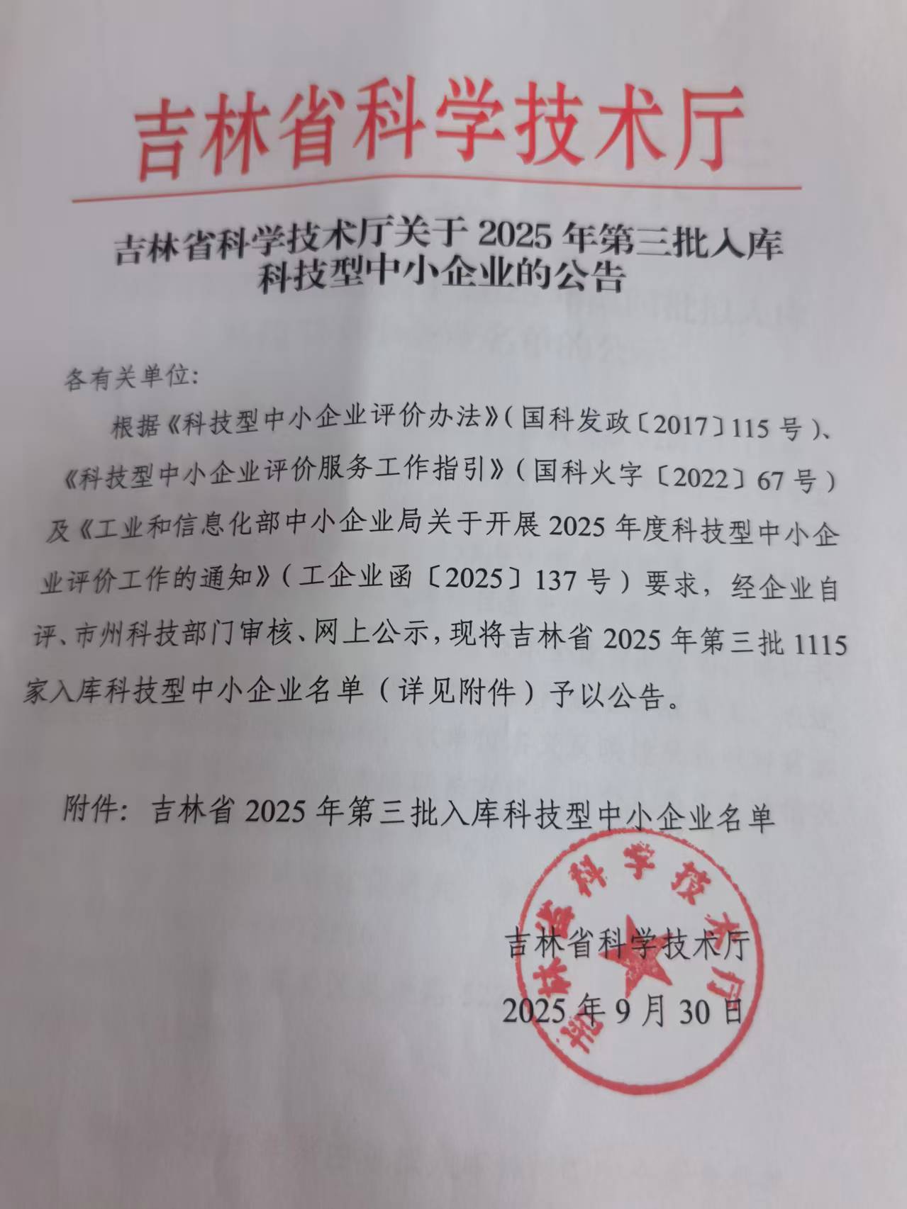 吉林省2025年第3批入库科技型中小企业名单公告正文.jpg PICTURE