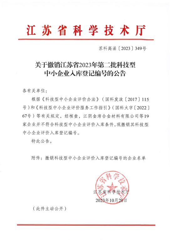 关于撤销江苏省2023年第二批科技型中小企业入库登记编号的公告.jpg PICTURE