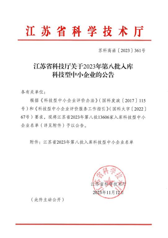 江苏省2023年第8批入库科技型中小企业名单公告正文.jpg PICTURE