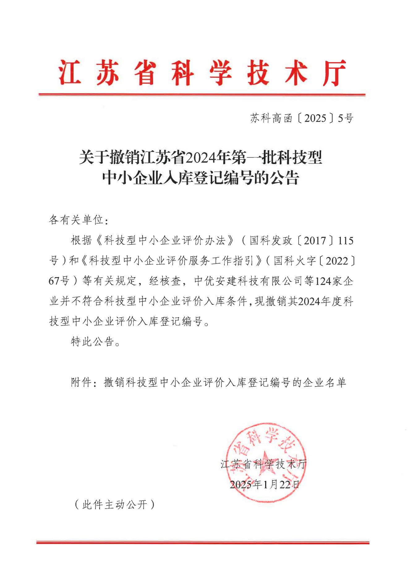 关于撤销江苏省2024年第一批科技型中小企业入库登记编号的公告.jpg PICTURE