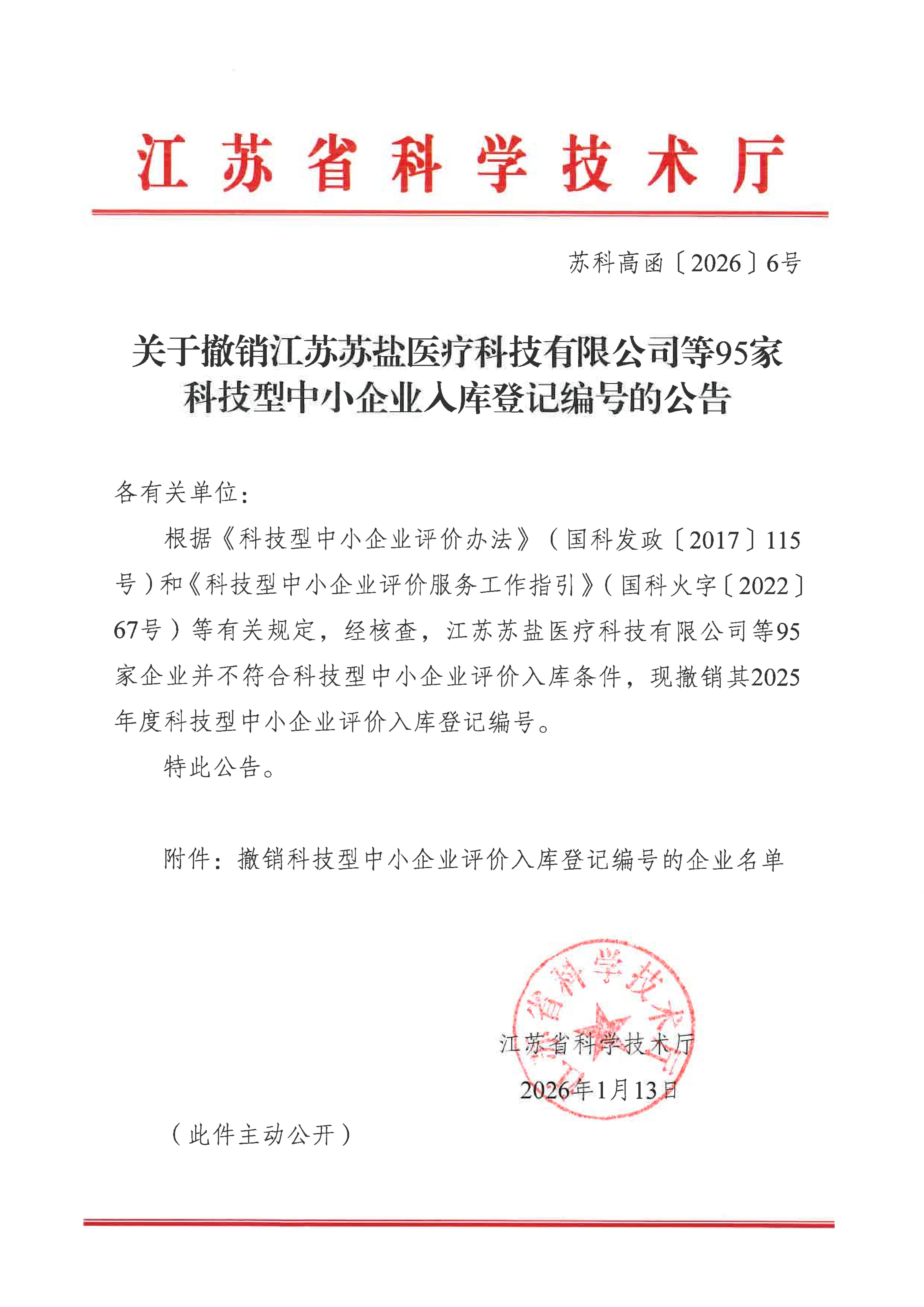 关于撤销江苏苏盐医疗科技有限公司等95家科技型中小企业入库登记编号的公告.jpg PICTURE