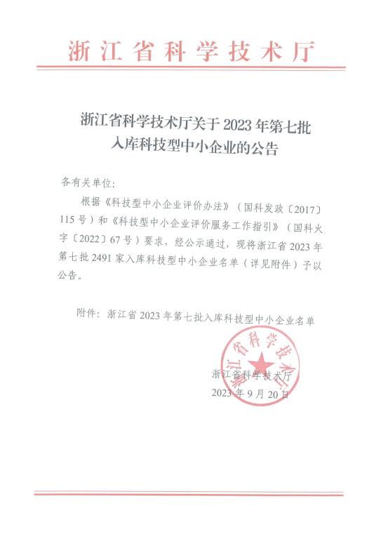 浙江省2023年第7批入库科技型中小企业名单公告正文.jpg PICTURE