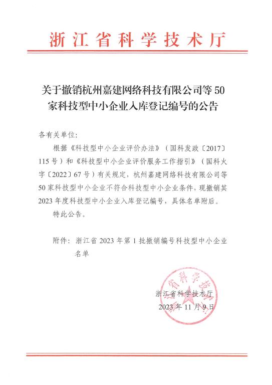 关于撤销杭州嘉建网络科技有限公司等50家科技型中小企业入库登记编号的公告_00.jpg PICTURE
