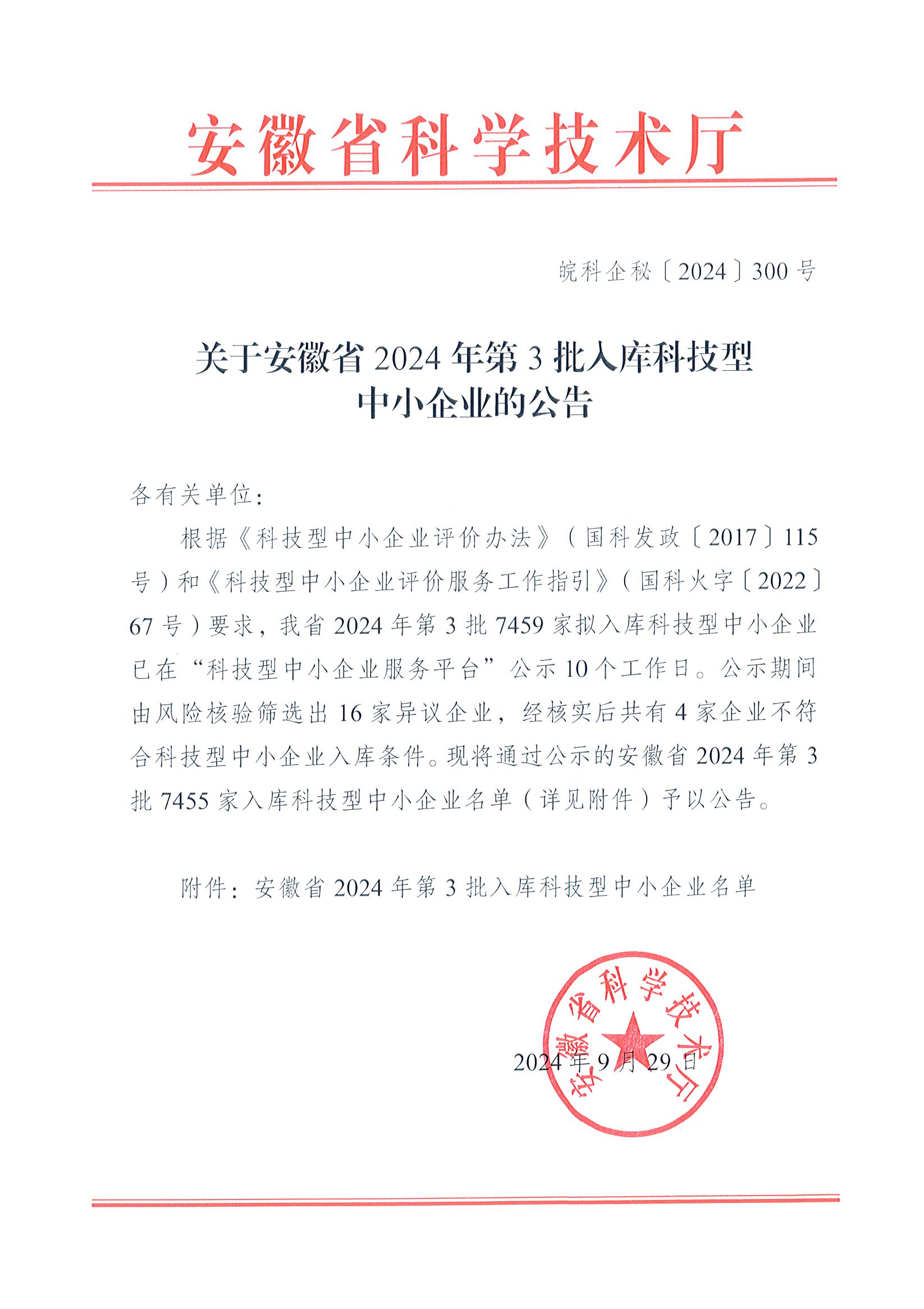 安徽省2024年第3批入库科技型中小企业名单公告正文.jpg PICTURE