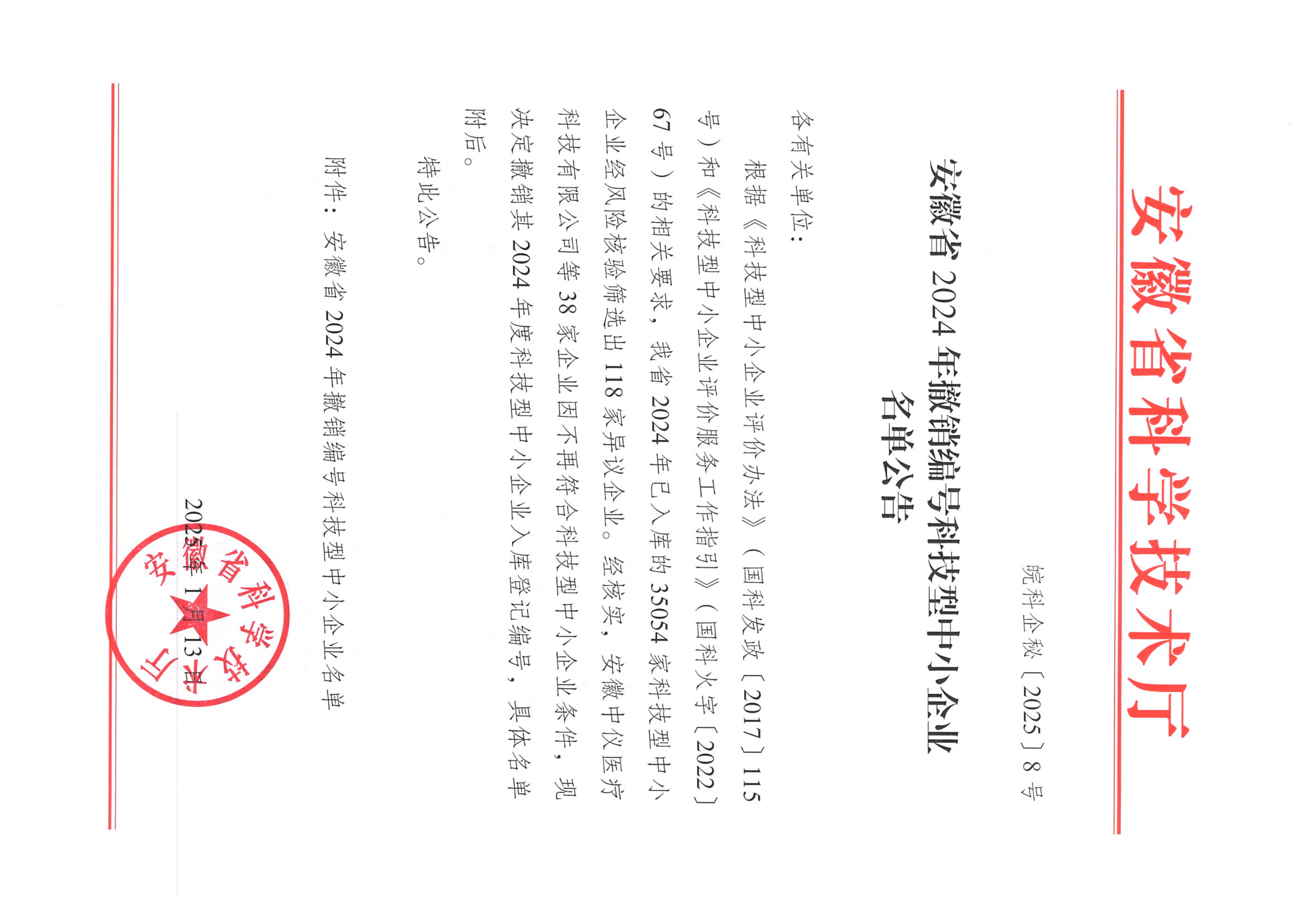 安徽省2024年撤销编号科技型中小企业名单公告.jpg PICTURE