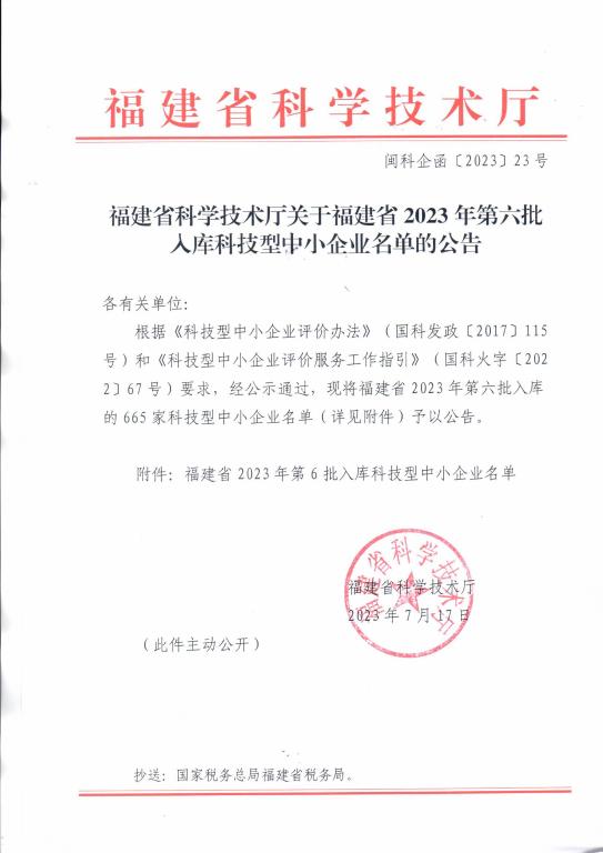 福建省2023年第6批入库科技型中小企业名单公告正文.jpg PICTURE