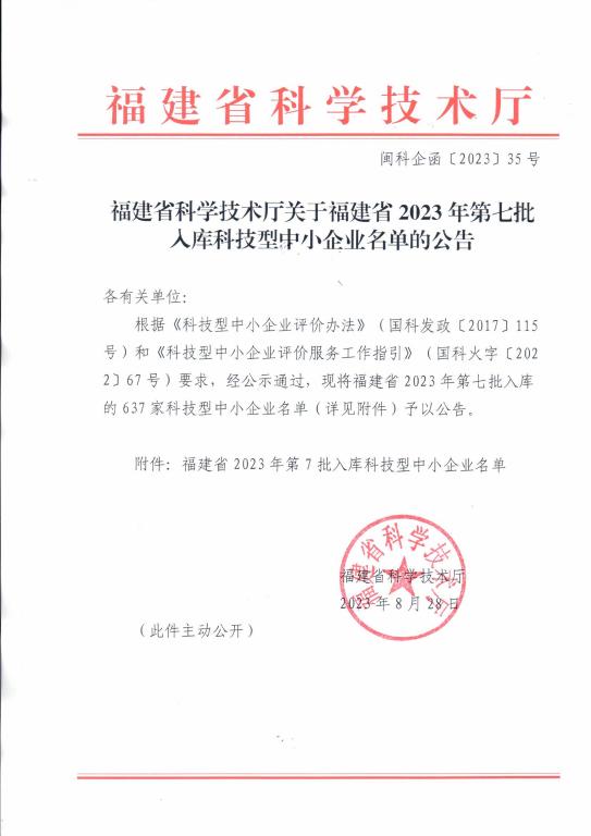福建省2023年第7批入库科技型中小企业名单公告正文.jpg PICTURE
