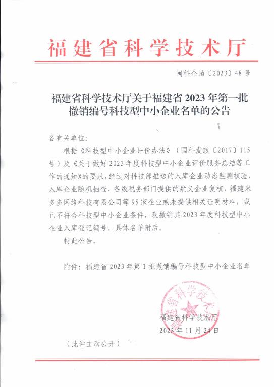 福建省科学技术厅关于福建省2023年第一批撤销编号科技型中小企业名单的公告.jpg PICTURE