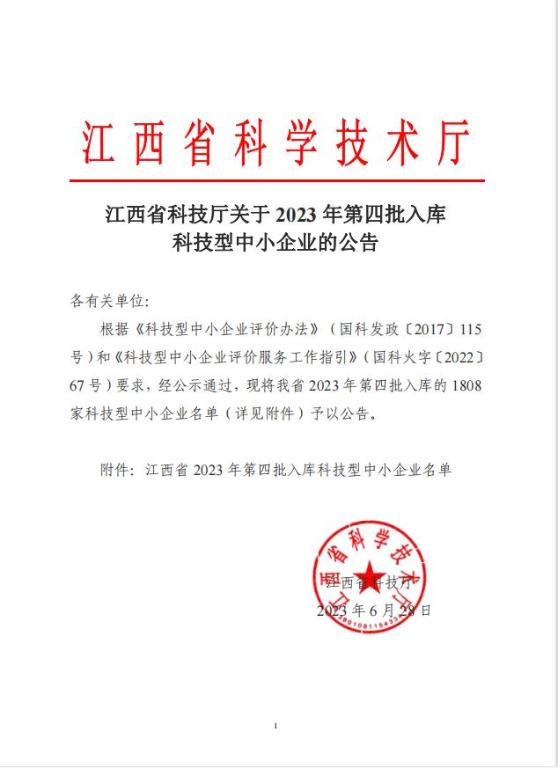 江西省2023年第4批入库科技型中小企业名单公告正文.jpg PICTURE