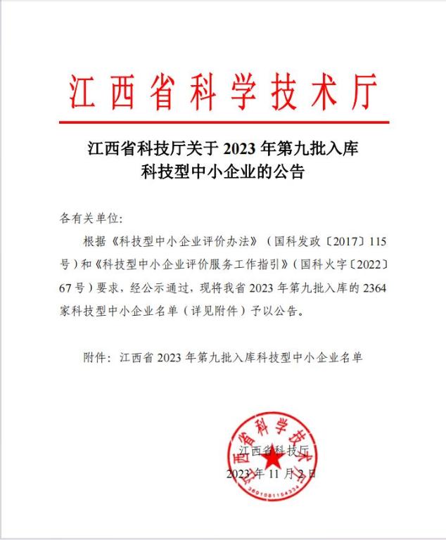 江西省2023年第9批入库科技型中小企业名单公告正文.jpg PICTURE