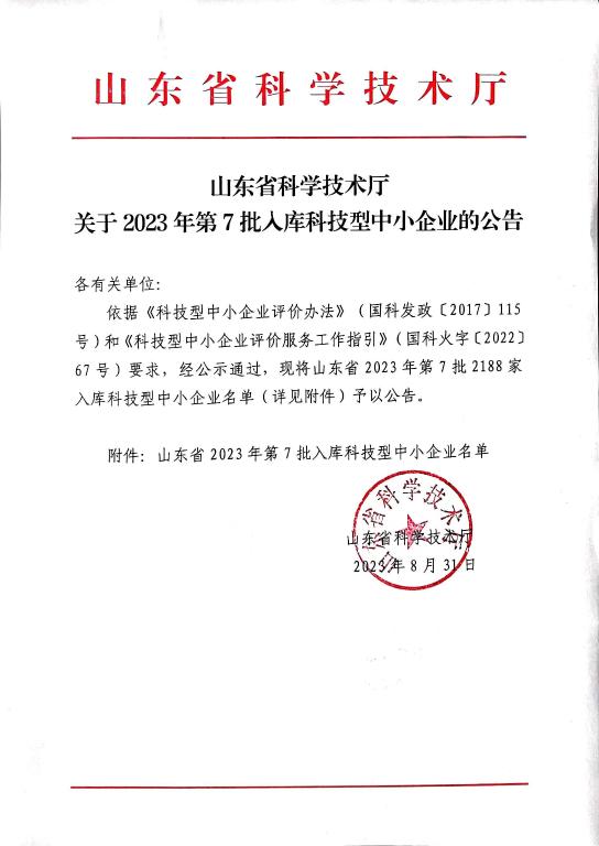 山东省2023年第7批入库科技型中小企业名单公告正文.jpg PICTURE