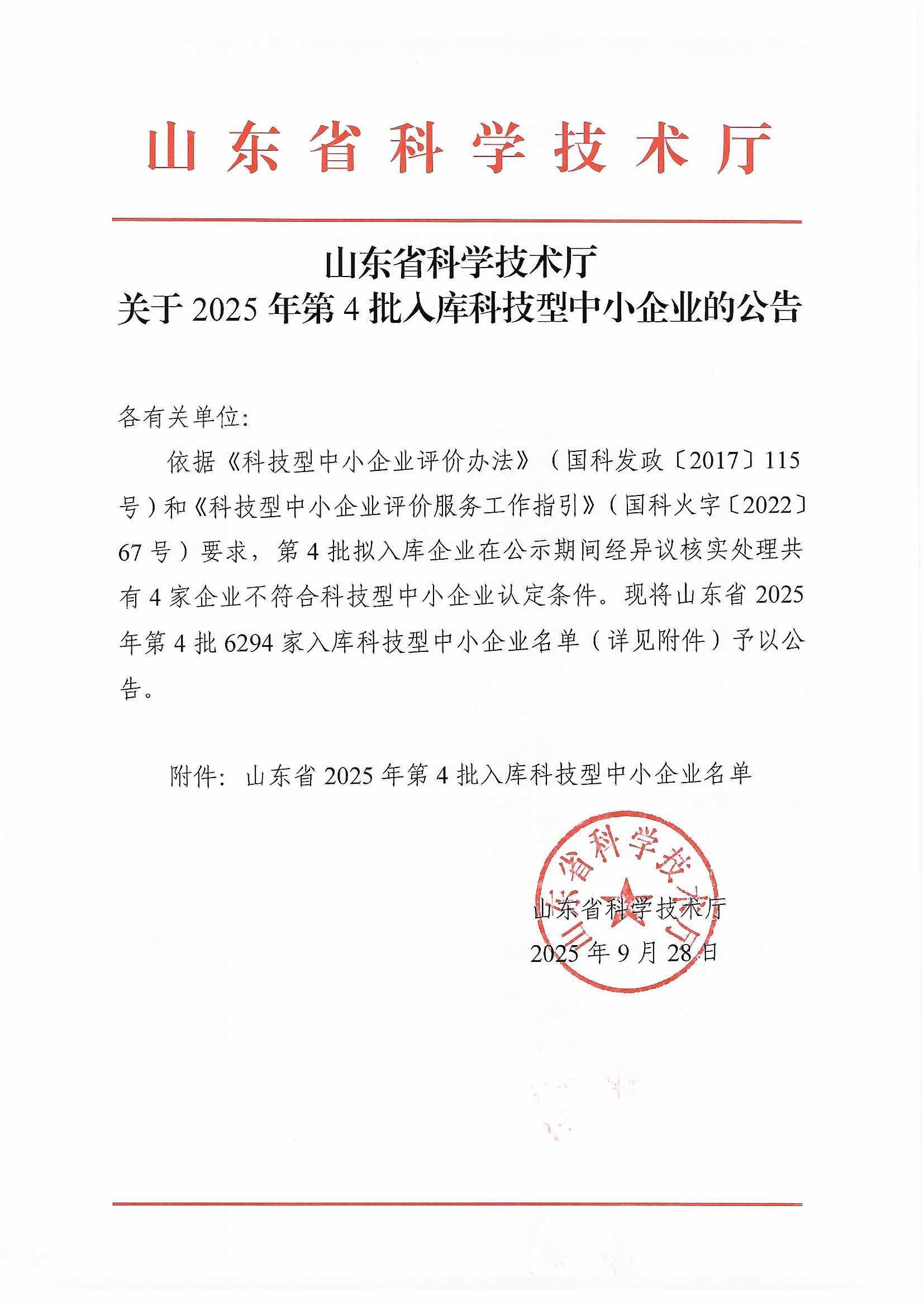 山东省2025年第4批入库科技型中小企业名单公告正文.jpg PICTURE