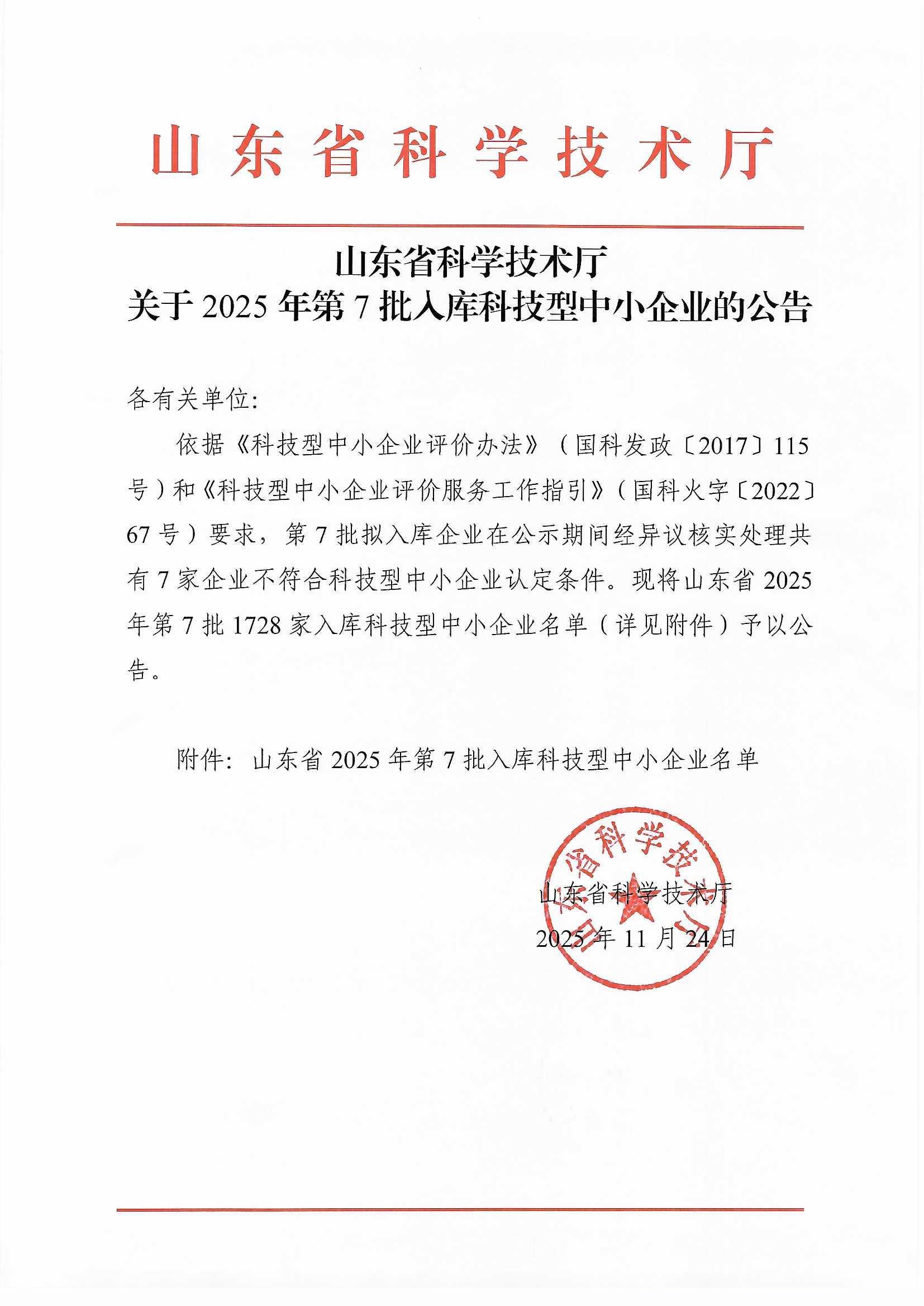 山东省2025年第7批入库科技型中小企业名单公告正文.jpg PICTURE