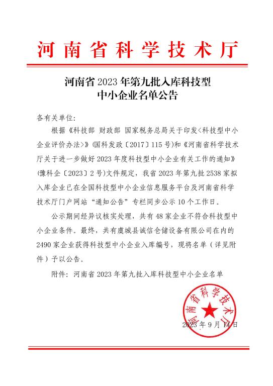 河南省2023年第9批入库科技型中小企业名单公告正文.jpg PICTURE