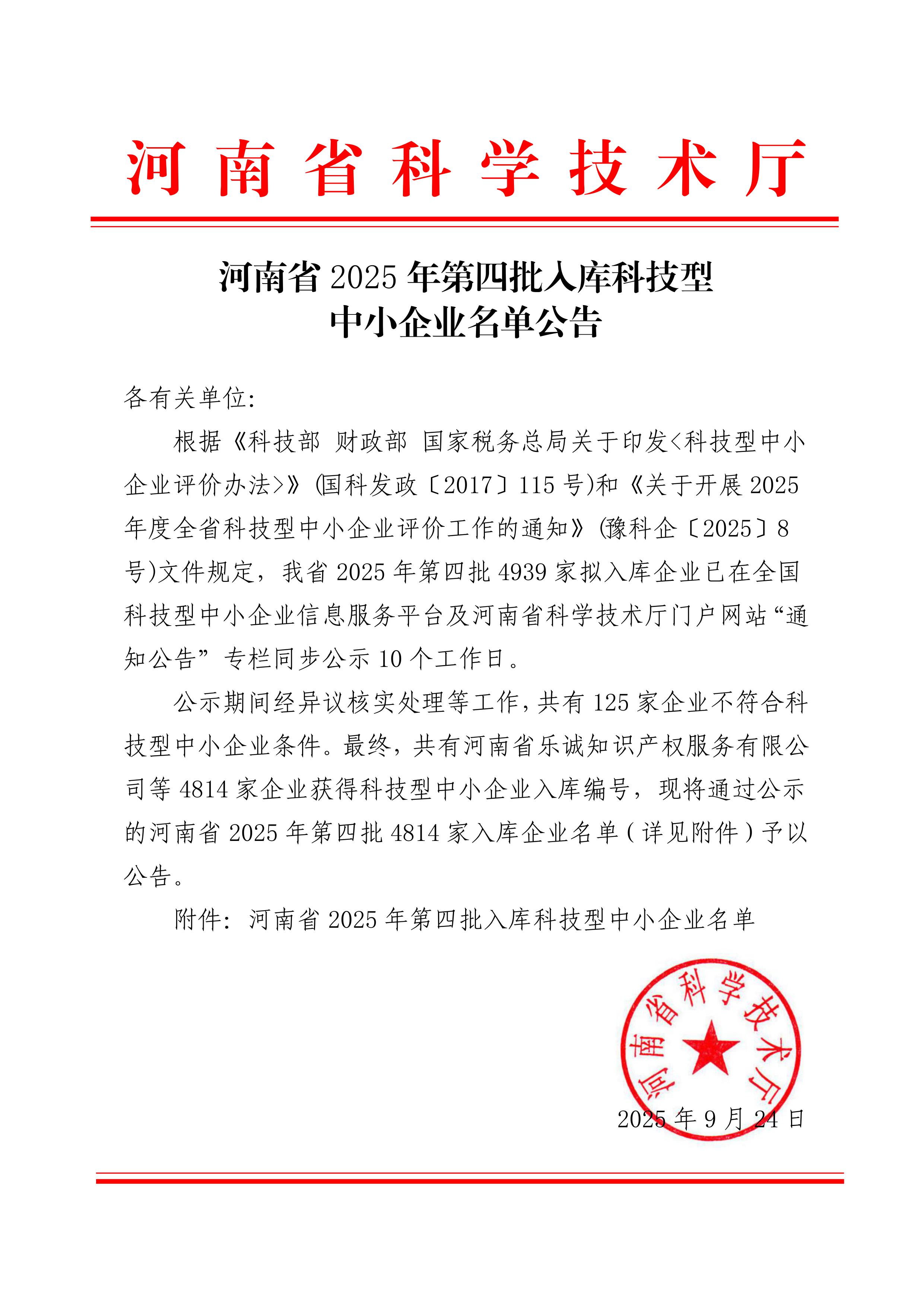 河南省2025年第4批入库科技型中小企业名单公告正文.jpg PICTURE