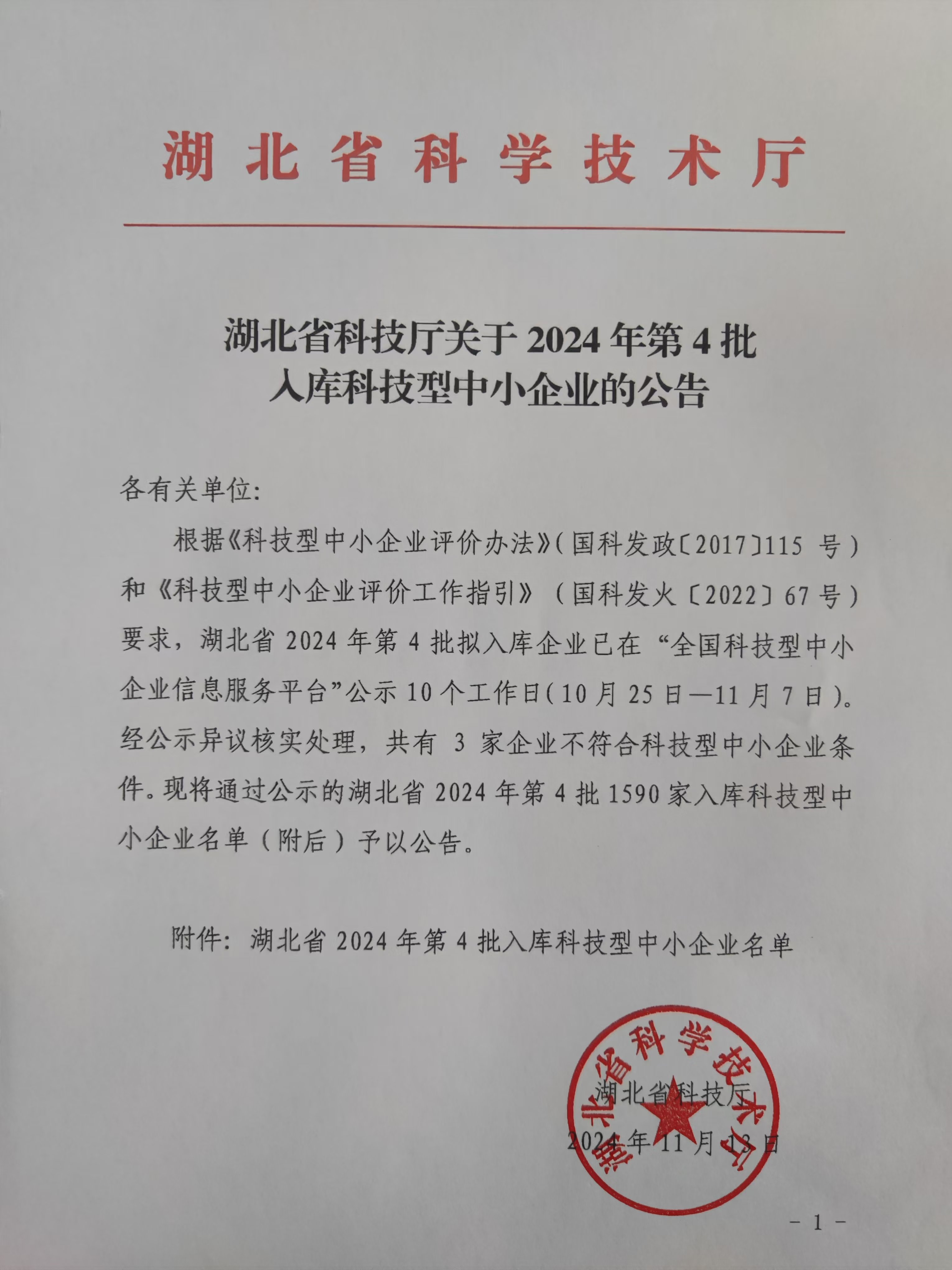 湖北省2024年第4批入库科技型中小企业名单公告正文.jpg PICTURE