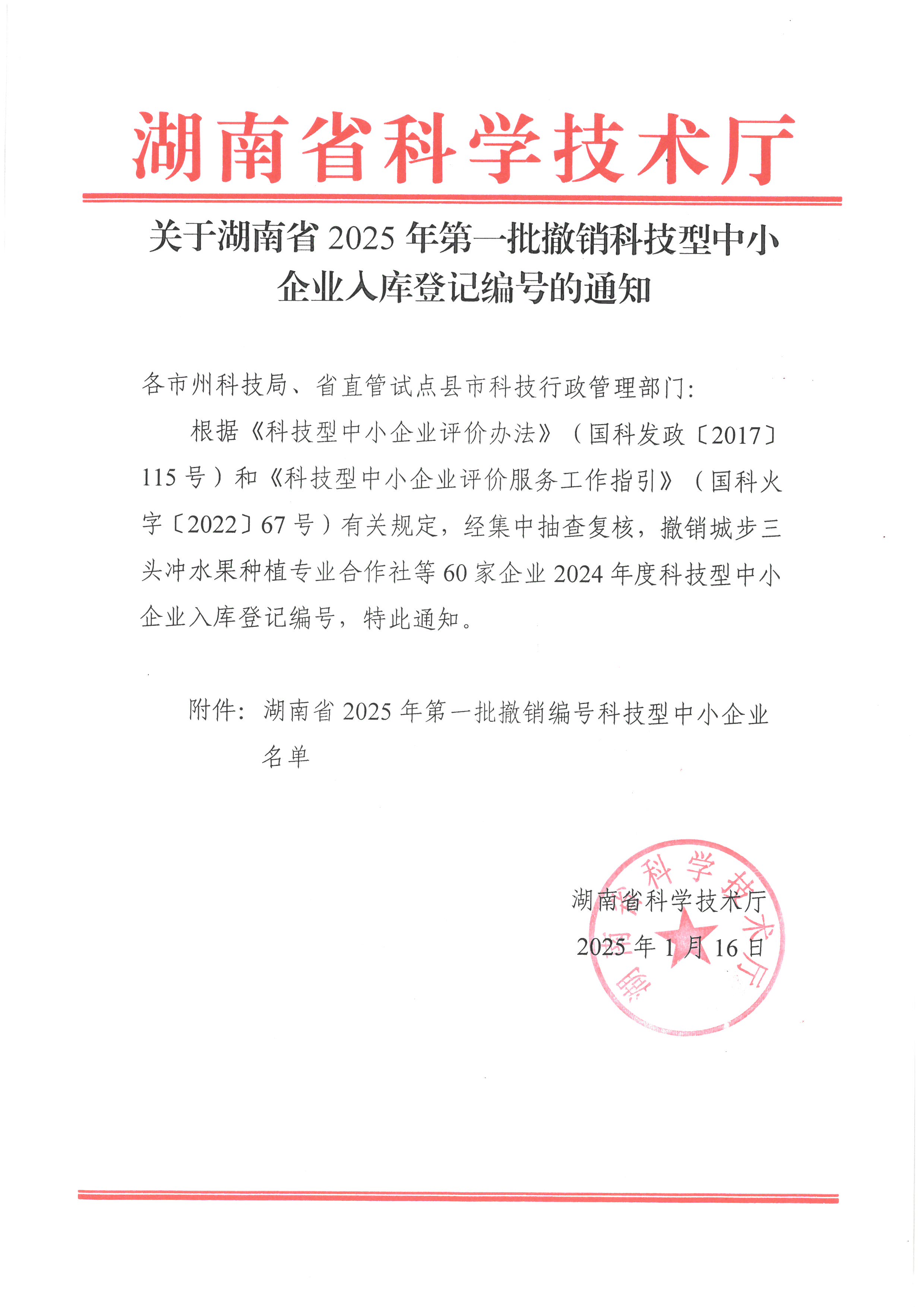 关于湖南省2025年第一批撤销科技型中小企业入库登记编号的通知.jpg PICTURE