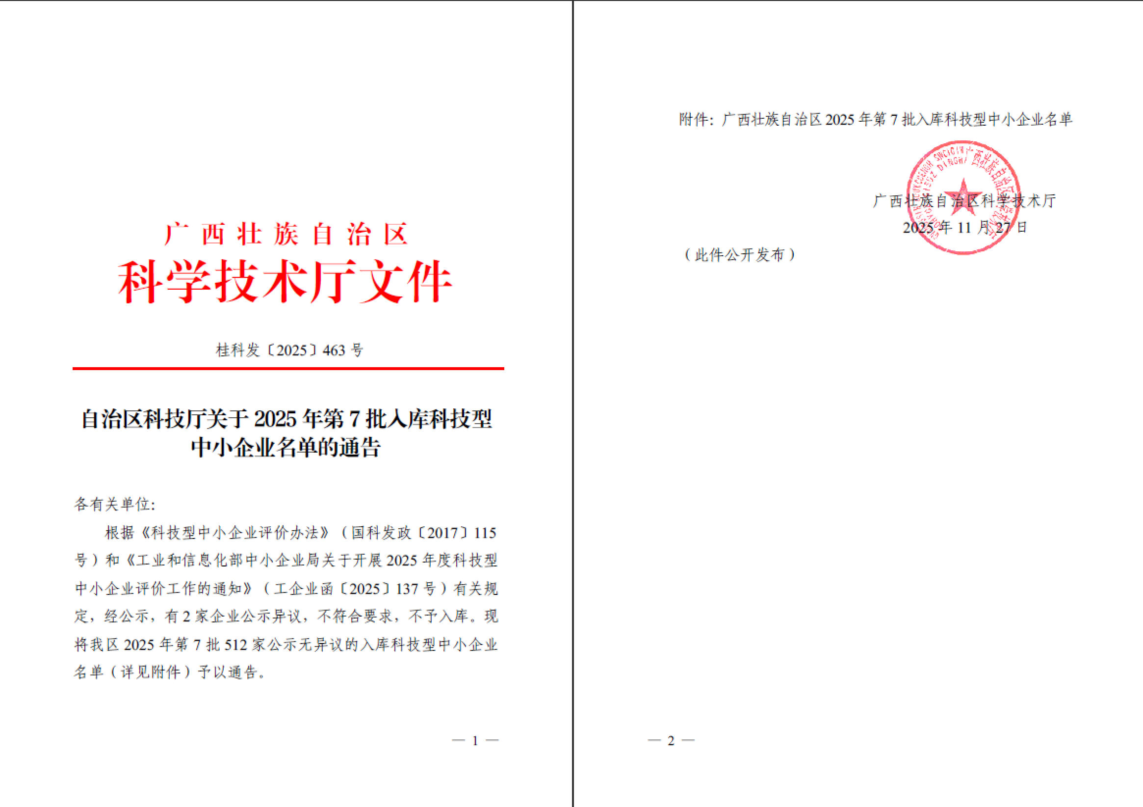 广西壮族自治区2025年第7批入库科技型中小企业名单公告正文.jpg PICTURE