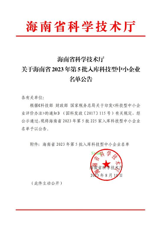 海南省2023年第5批入库科技型中小企业名单公告正文.jpg PICTURE