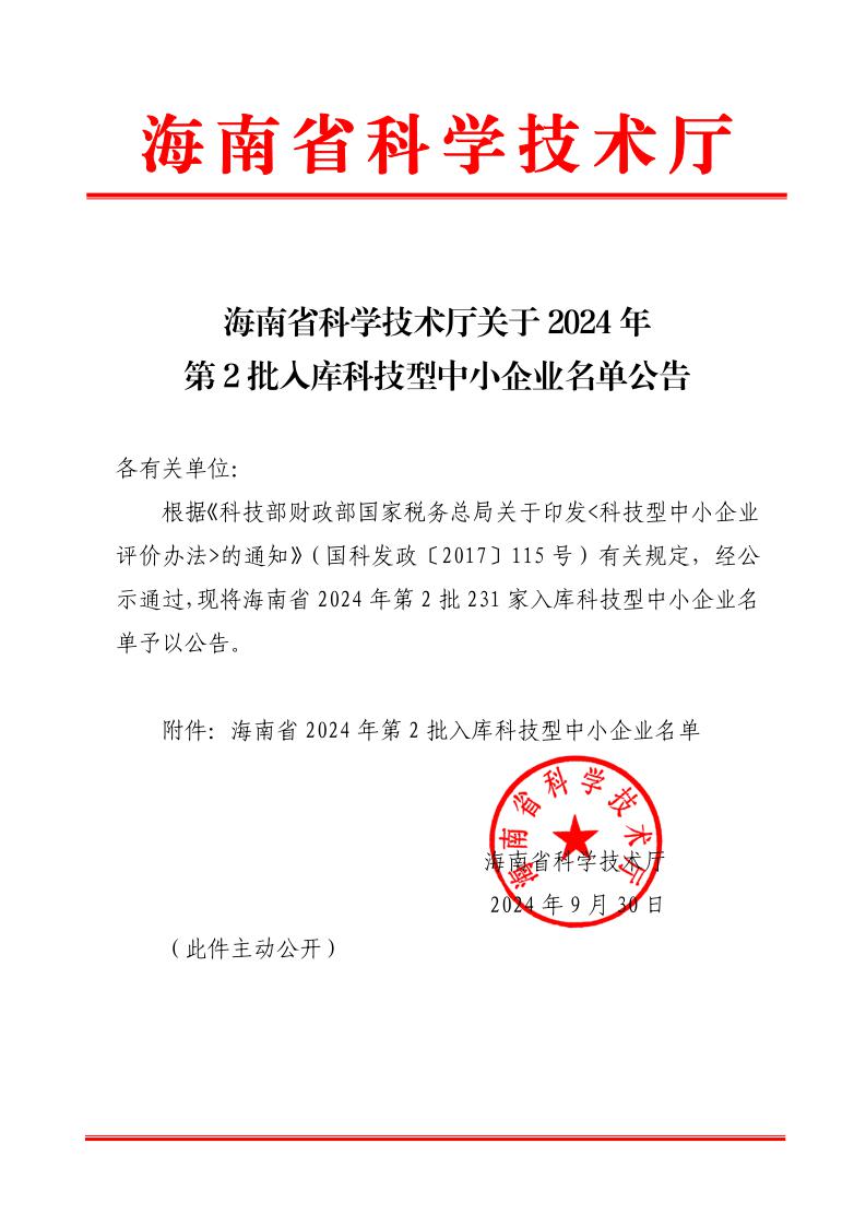 海南省2024年第2批入库科技型中小企业名单公告正文.jpg PICTURE