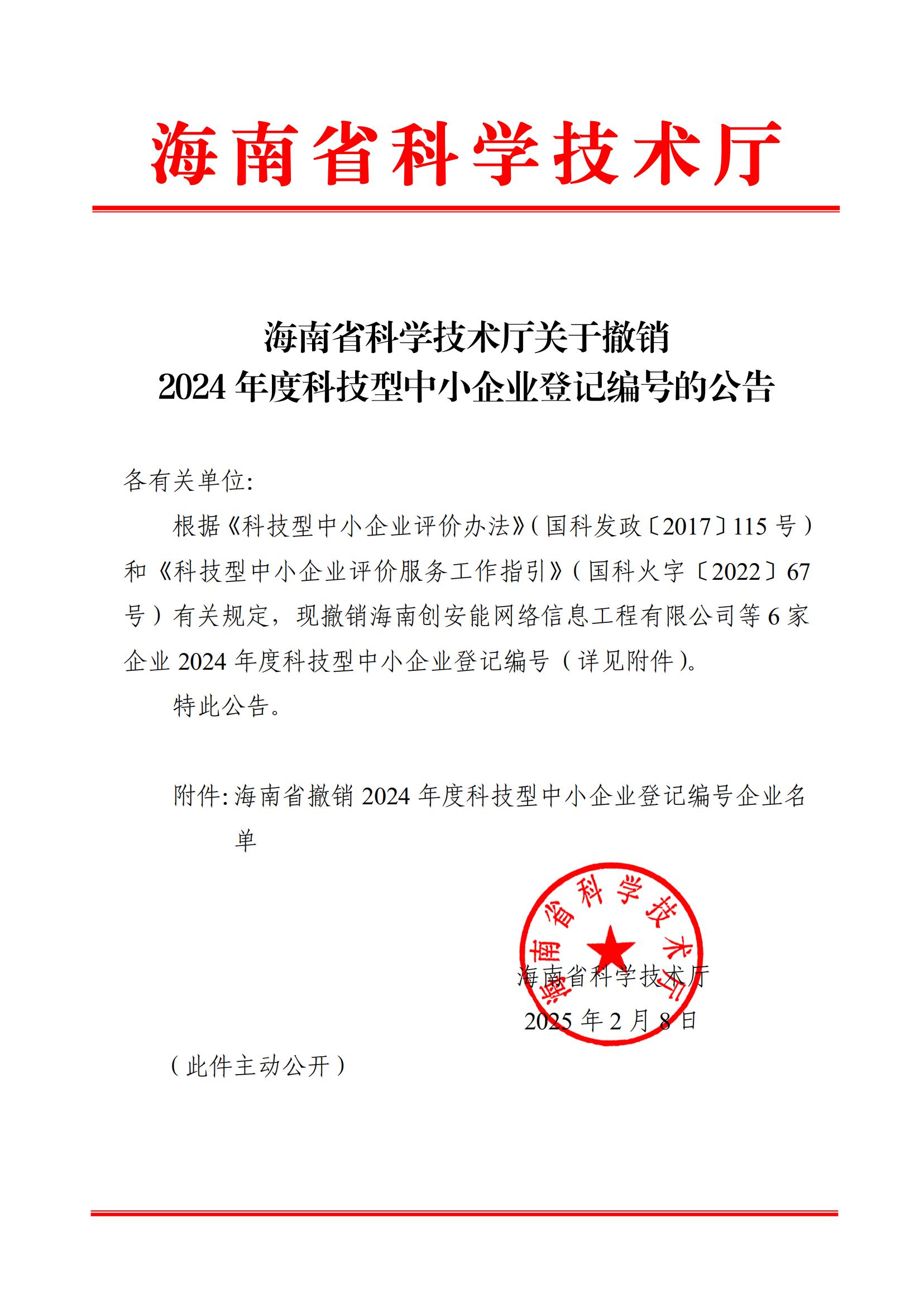 海南省科学技术厅关于撤销2024年度科技型中小企业登记编号的公告_00.jpg PICTURE