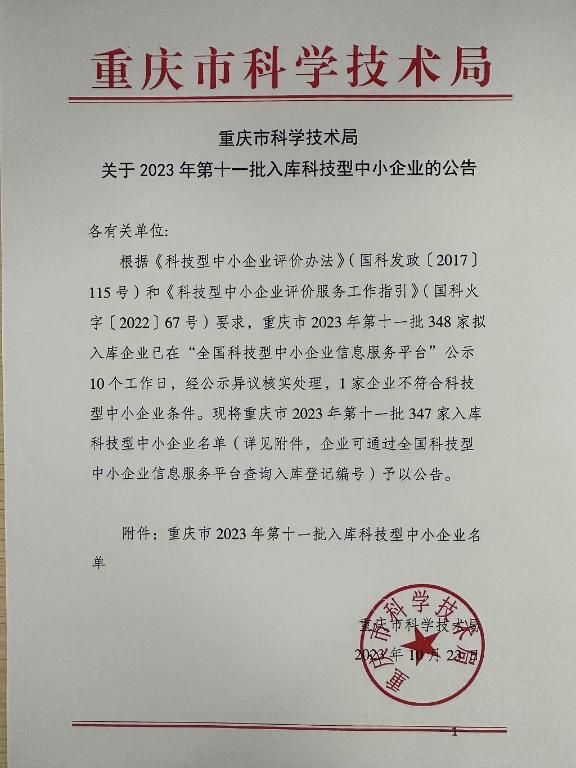 重庆市2023年第11批入库科技型中小企业名单公告正文.jpg PICTURE