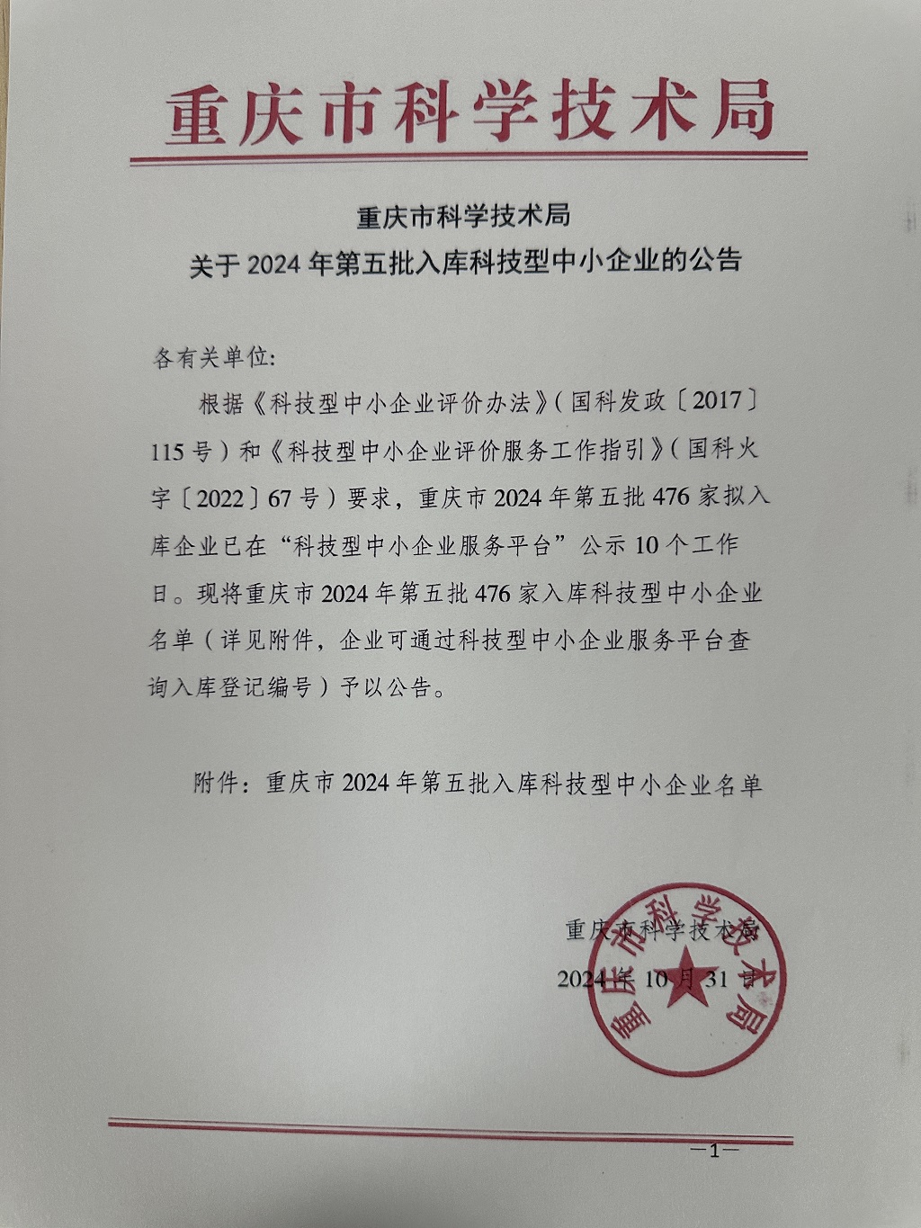 重庆市2024年第5批入库科技型中小企业名单公告正文.jpg PICTURE
