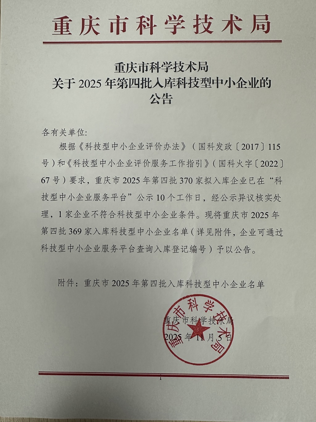 重庆市2025年第4批入库科技型中小企业名单公告正文.jpg PICTURE