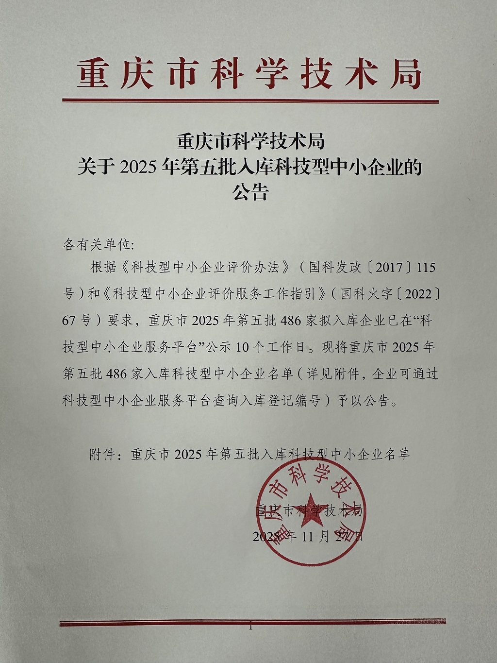 重庆市2025年第5批入库科技型中小企业名单公告正文.jpg PICTURE