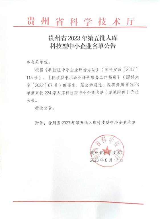 贵州省2023年第5批入库科技型中小企业名单公告正文.jpg PICTURE