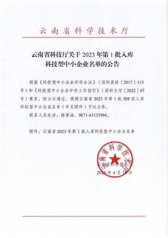 云南省2023年第1批入库科技型中小企业名单公告正文.jpg PICTURE