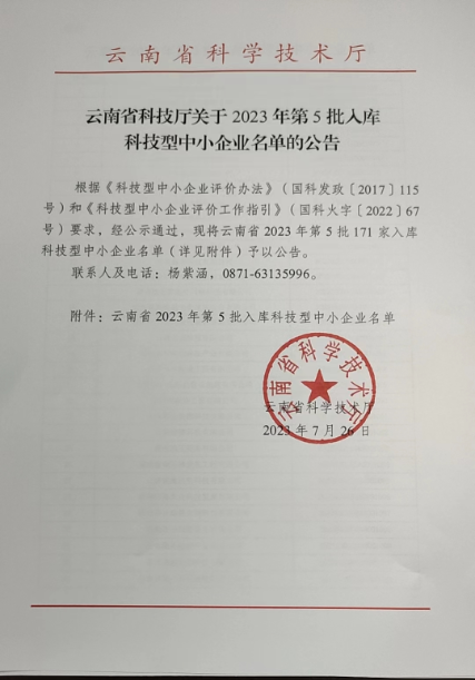 云南省2023年第5批入库科技型中小企业名单公告正文.jpg PICTURE