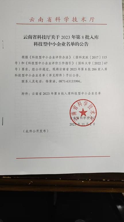 云南省2023年第8批入库科技型中小企业名单公告正文.jpg PICTURE