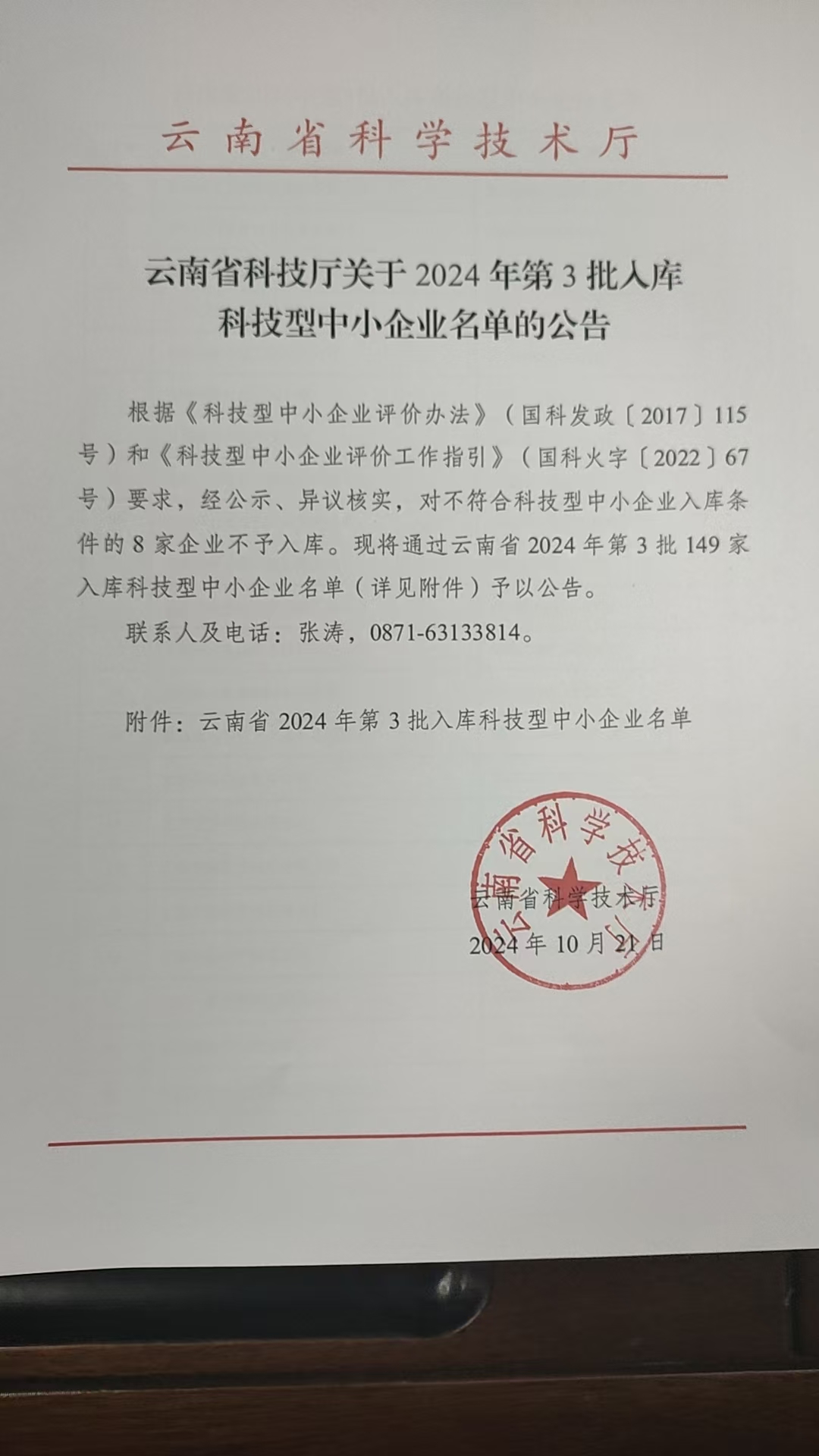 云南省2024年第3批入库科技型中小企业名单公告正文.jpg PICTURE