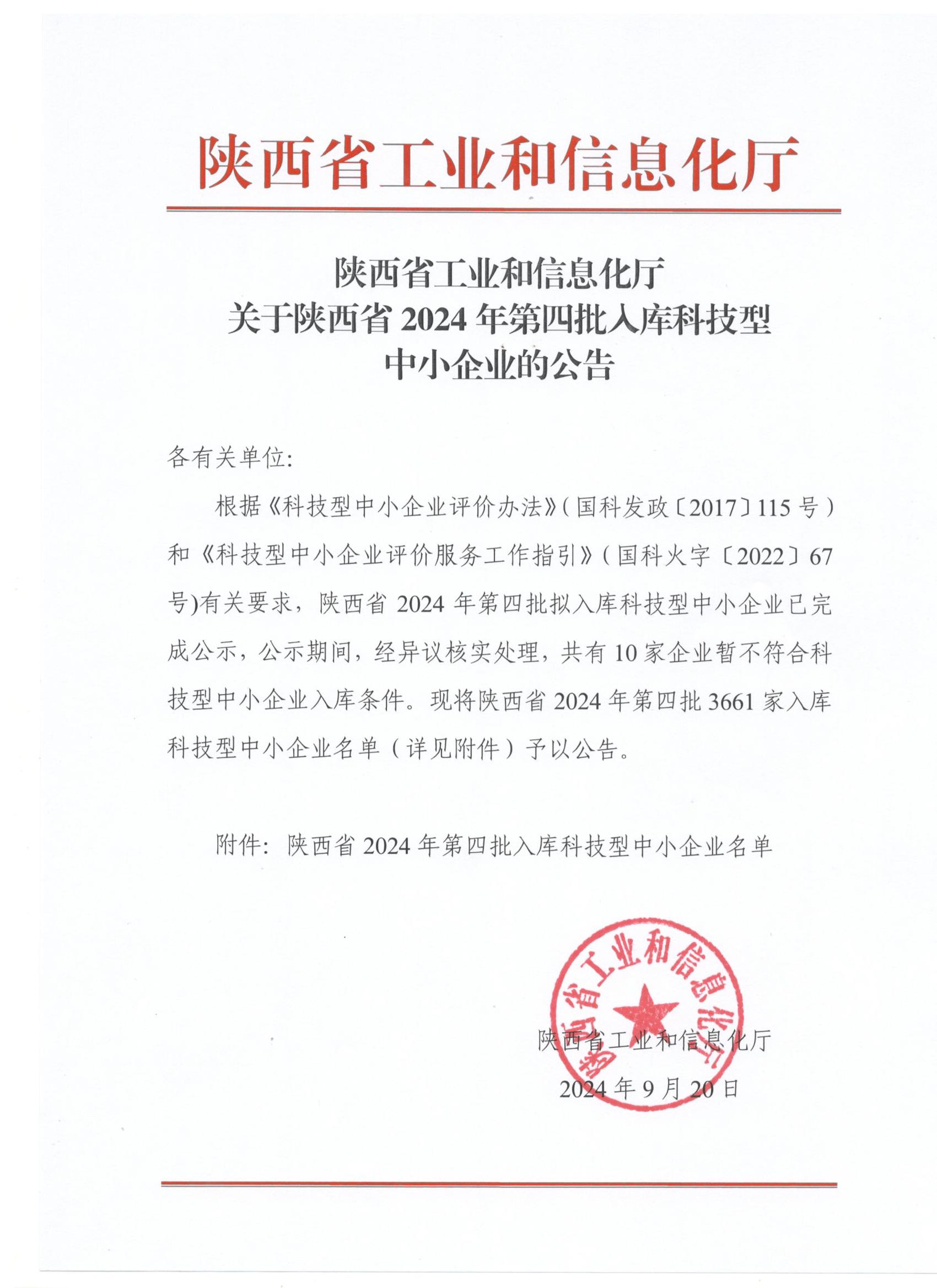 陕西省2024年第4批入库科技型中小企业名单公告正文.jpg PICTURE