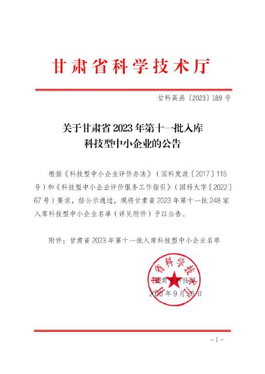 甘肃省2023年第11批入库科技型中小企业名单公告正文.jpg PICTURE