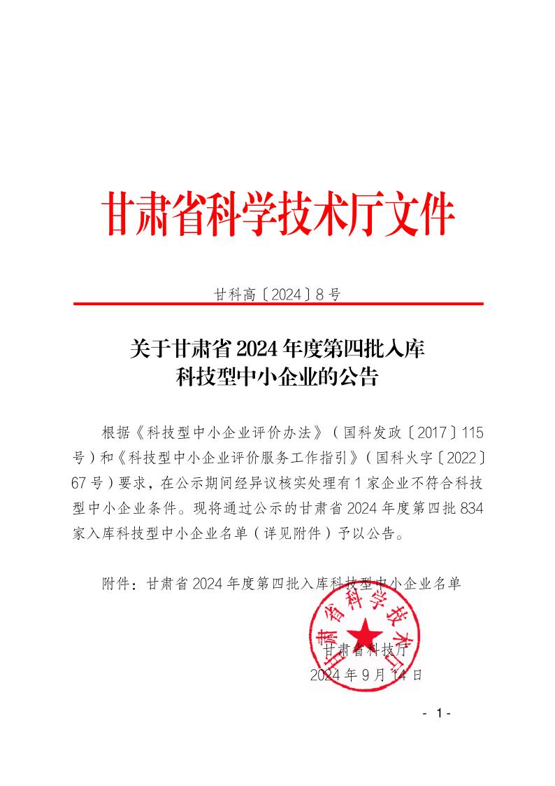 甘肃省2024年第4批入库科技型中小企业名单公告正文.jpg PICTURE