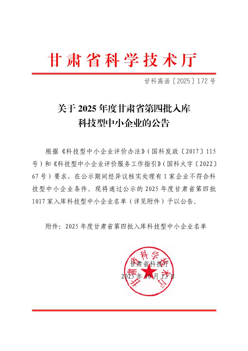 甘肃省2025年第4批入库科技型中小企业名单公告正文.jpg PICTURE