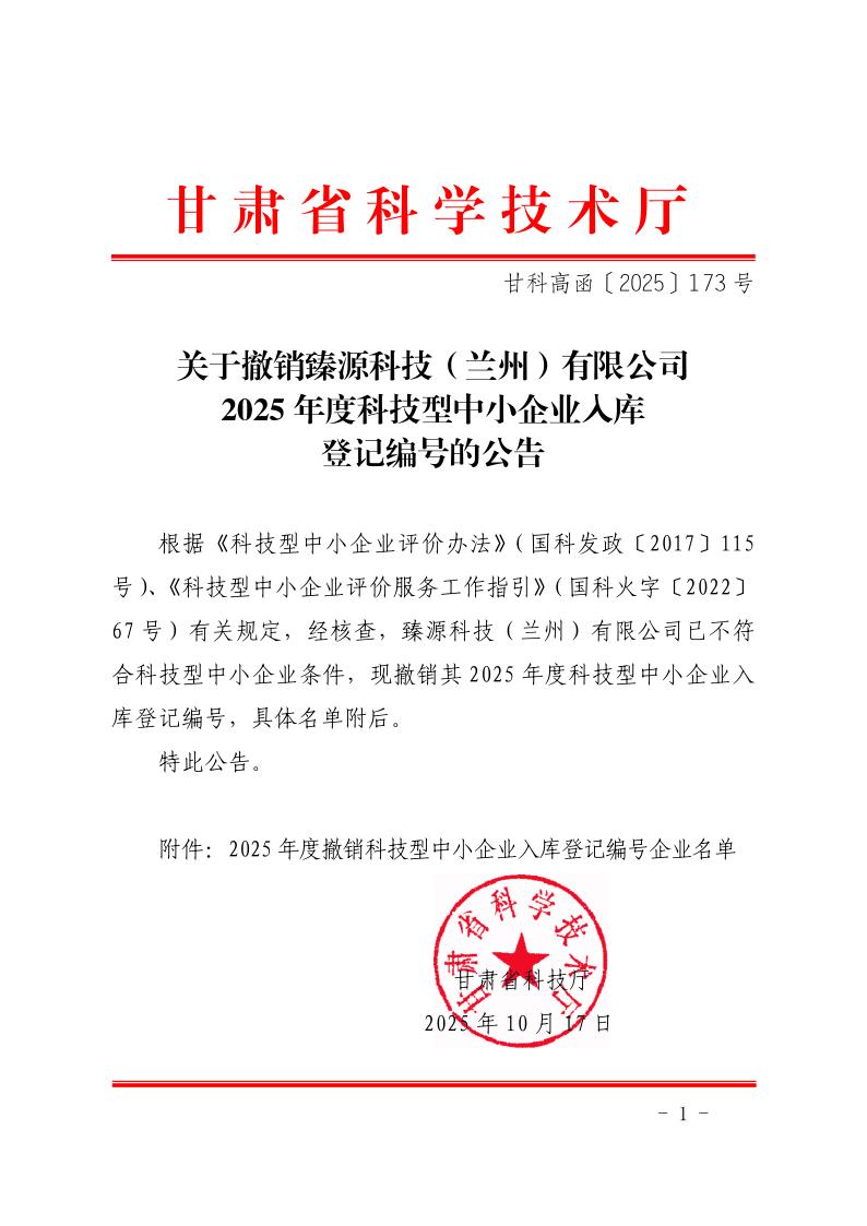 关于撤销臻源科技(兰州)有限公司2025年度科技型中小企业入库登记编号的公告_1.jpg PICTURE