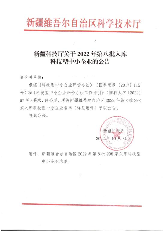 新疆维吾尔自治区2022年第8批入库科技型中小企业名单公告正文.jpg PICTURE