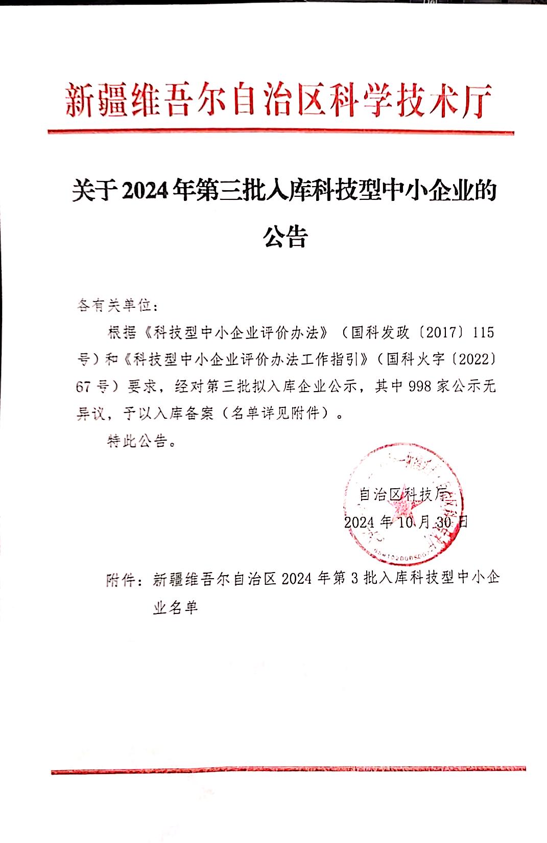 新疆维吾尔自治区2024年第3批入库科技型中小企业名单公告正文.jpg PICTURE