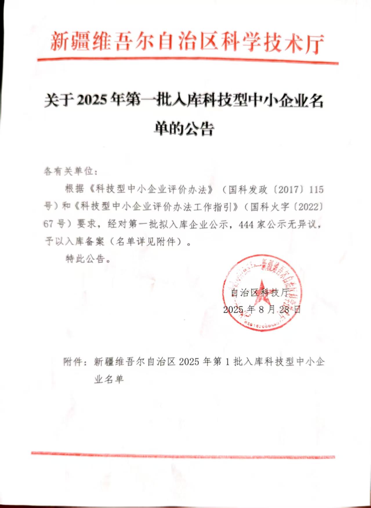 新疆维吾尔自治区2025年第1批入库科技型中小企业名单公告正文.jpg PICTURE