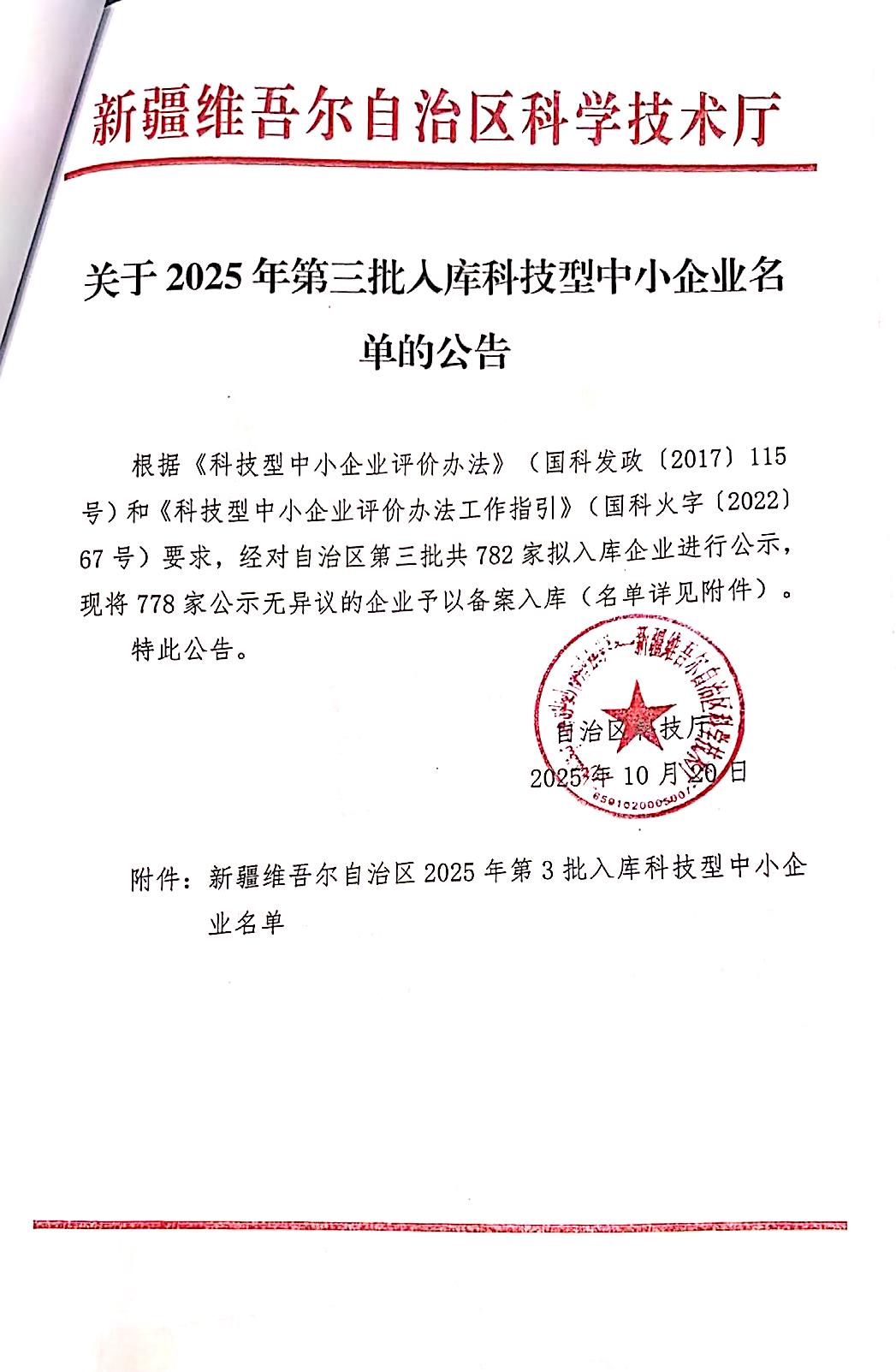 新疆维吾尔自治区2025年第3批入库科技型中小企业名单公告正文.jpg PICTURE