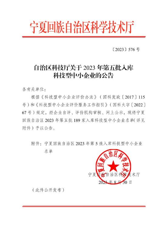 宁夏回族自治区2023年第5批入库科技型中小企业名单公告正文.jpg PICTURE