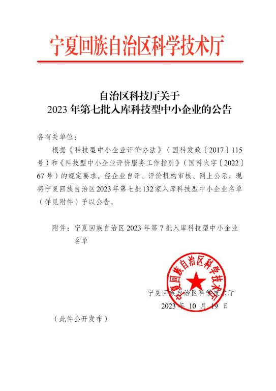宁夏回族自治区2023年第7批入库科技型中小企业名单公告正文.jpg PICTURE