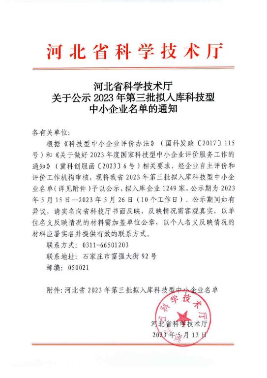 河北省2023年第3批拟入库科技型中小企业名单公示正文.jpg PICTURE