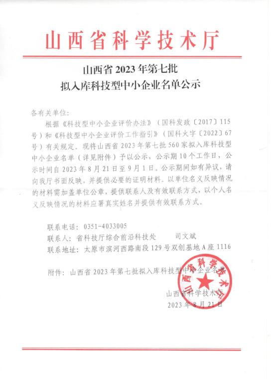 山西省2023年第7批拟入库科技型中小企业名单公示正文.jpg PICTURE