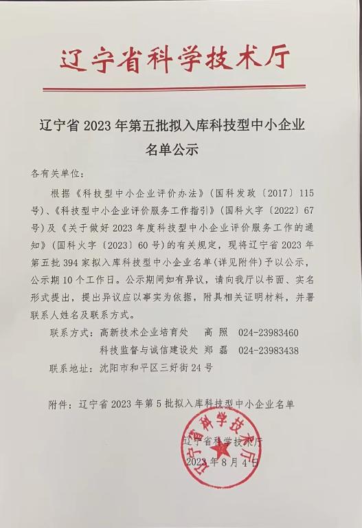 辽宁省2023年第5批拟入库科技型中小企业名单公示正文.jpg PICTURE