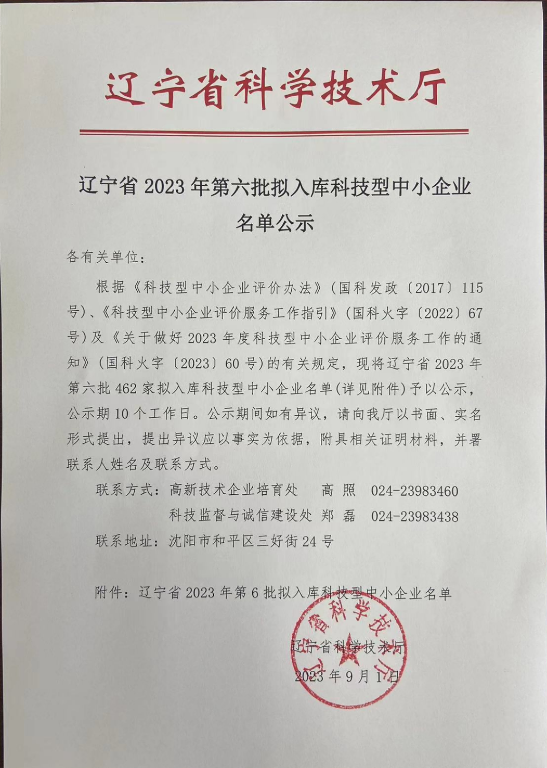 辽宁省2023年第6批拟入库科技型中小企业名单公示正文.jpg PICTURE