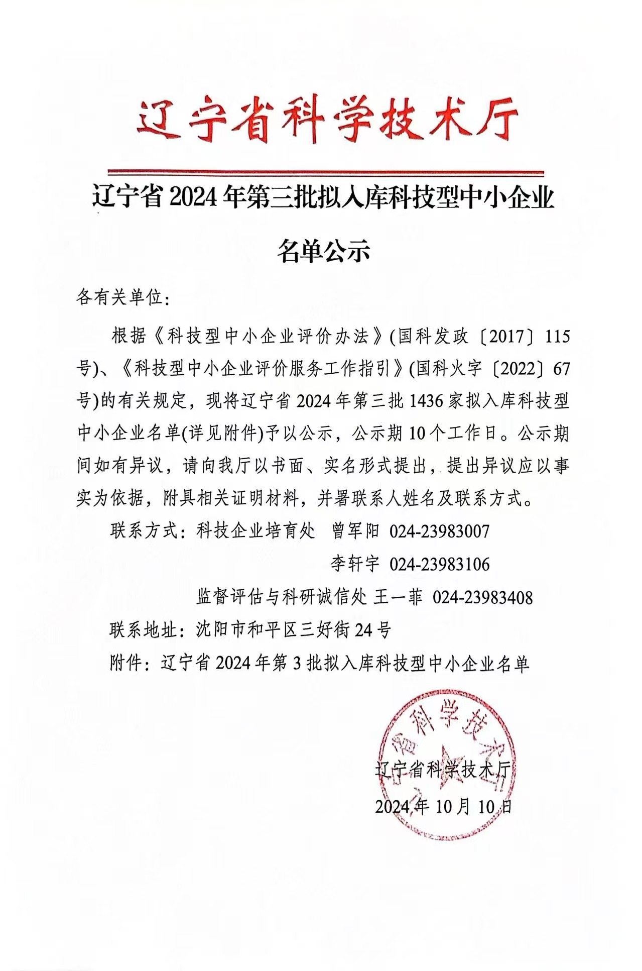 辽宁省2024年第3批拟入库科技型中小企业名单公示正文.jpg PICTURE